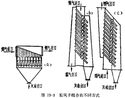 立式多管旋风除尘器旋风子的布置,除了如图13-1所示的方式被广泛采用外,还可有其它不同的布置方式。图13-3是几种不同的旋风子布置方式。图 13-3(a)表示一台立式多管旋风除尘器,其旋风子轴线位于垂直位置,但其排气管高度不等,这样可以减小除尘器的总高度。图13-3(b)及(c)是旋 风子的轴线与水平方向成某一角度的布置方式,这种旋风子的布置可以使除尘器在平面上所占面积减至最小,同时又能使除尘器安装在上升或下降的烟气气流中。